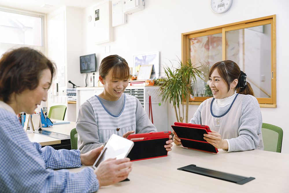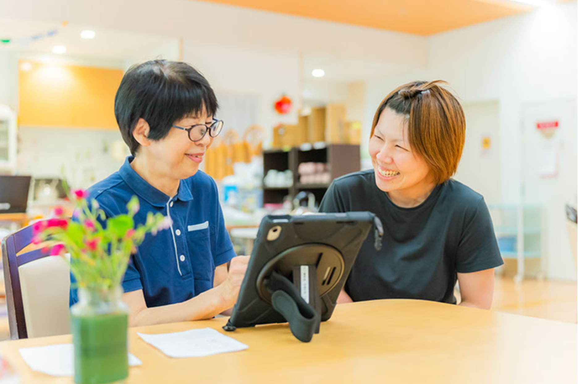 働きやすい職場づくりの一環として、働き方に合わせた制度を導入しています。介護や保育など人員基準のある事業所では、1ヶ月単位の変形労働時間制を採用し、効率よく働けるよう調整。ICカードで勤怠を管理し、残業が多い場合は上司が声をかけるなど無理のない働き方をサポートしています。事務職ではフレックスタイム制を導入し、柔軟な働き方を実施。残業時間の削減と仕事と生活の調和、業務効率の向上を図っています。