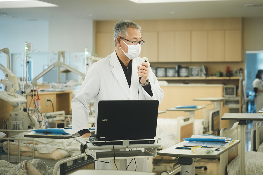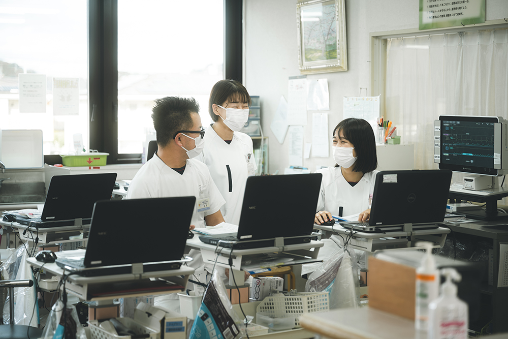 看護部では愛媛大学から講師を招き、月に一度、看護研究を行っています。誰でも気軽に参加することができ、多職種でさまざまな研究を行い、透析学会、看護学会、慢性期医療学会等で発表しています。今後の目標としては次年度より最新の知識や技術を身につけるためeラーニングを導入し、病院全体の全職員がいつでも学習できる環境をつくることです。