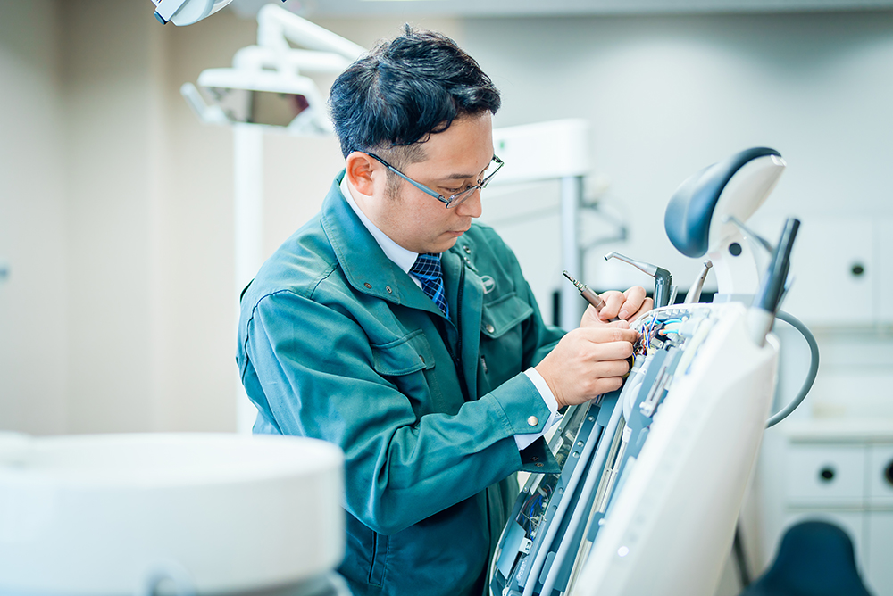 玉井歯科商店は中四国の歯科関係施設(歯科医院・歯科技工所・病院・大学等)へ診療用の材料・器械・医薬品を販売する歯科専門の商社です。また、販売後のアフターメンテナンスや、時には新規開業のプロデュースなど、ワンストップでサポート。お得意様が安心して治療に専念できる環境づくりを目指しています。