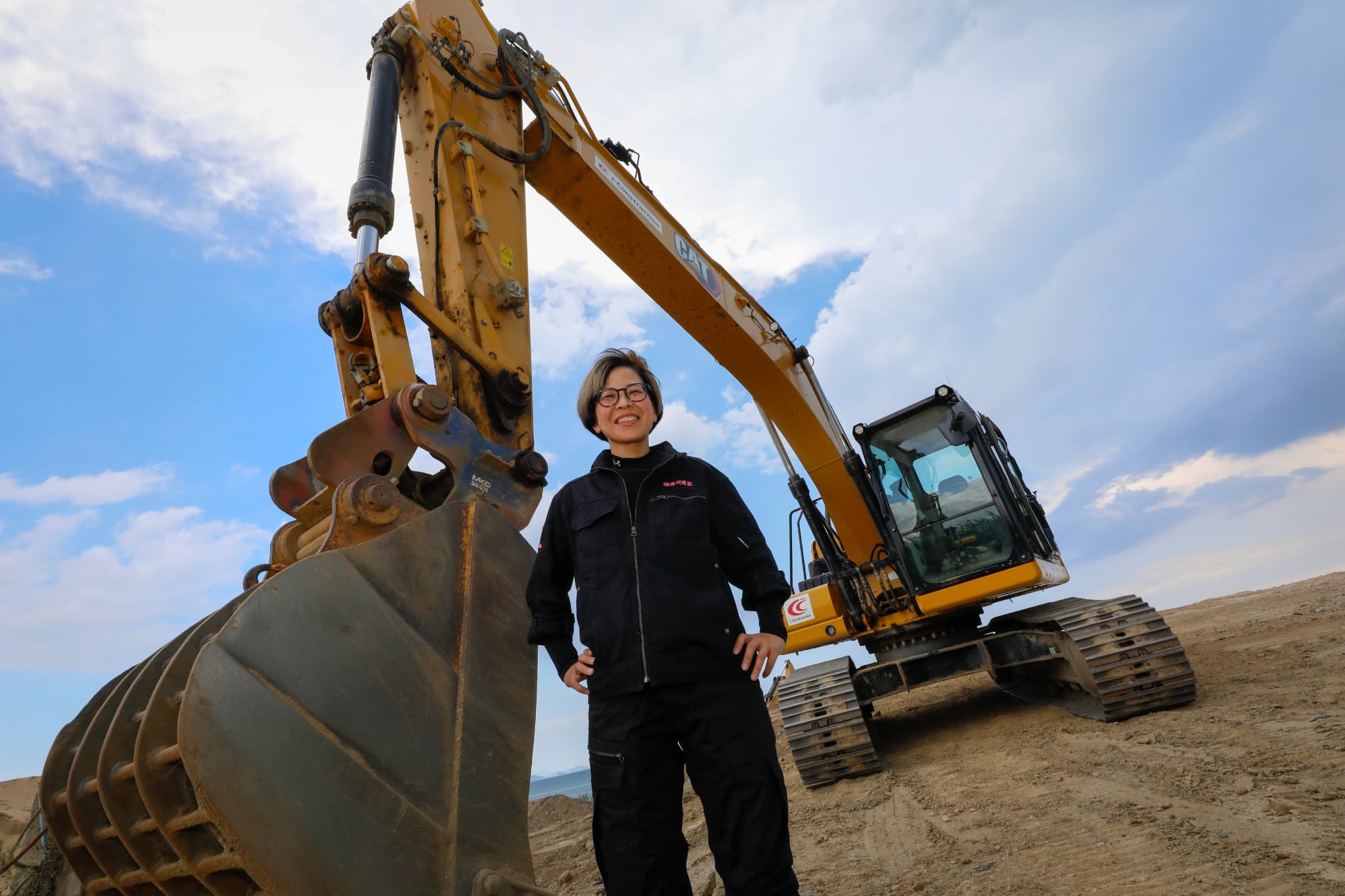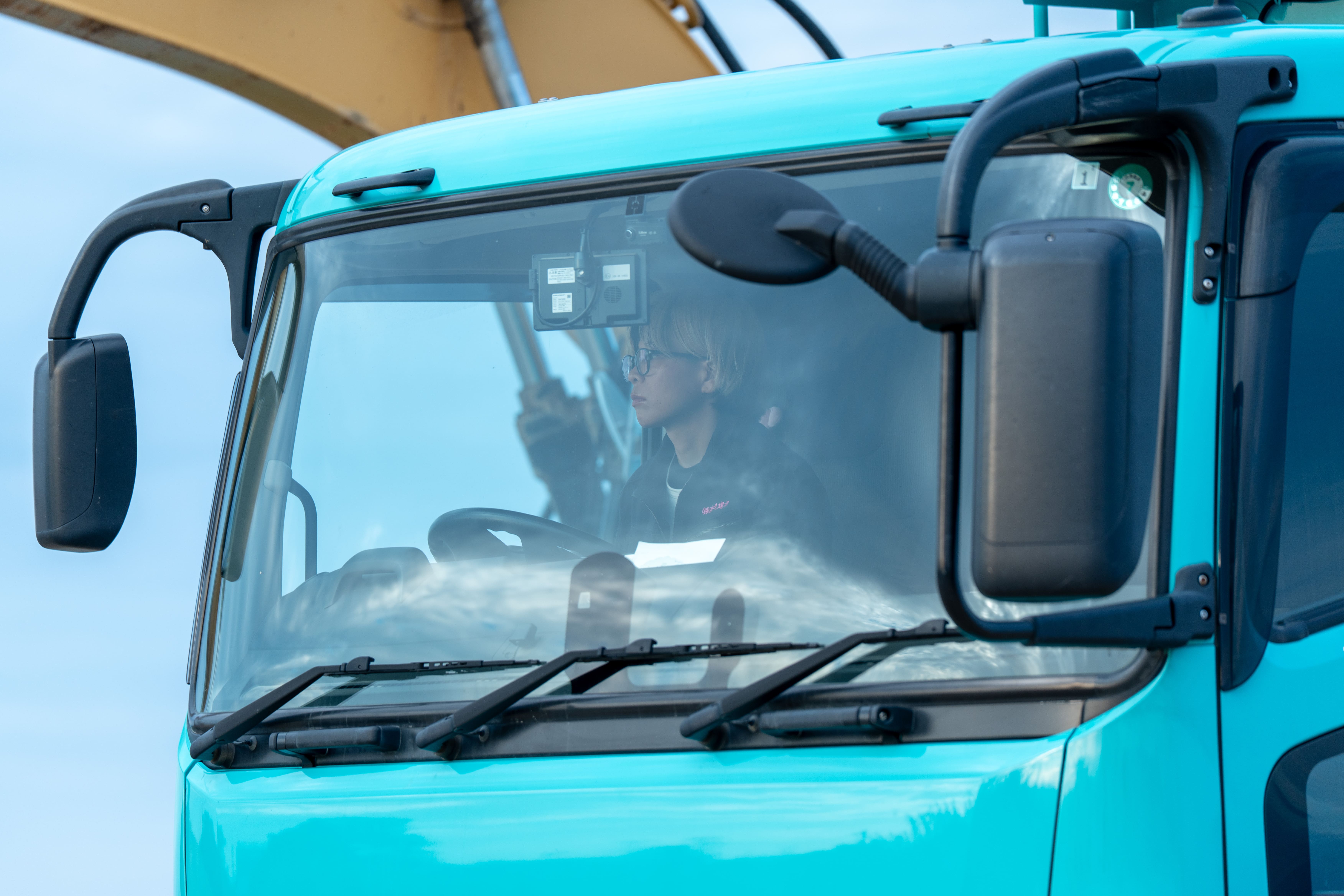私はまだ大型免許を取得して2年目ですが、最初は本当に乗れるのかと不安でした。でも、「免許を取らせてもらったからには乗らないと!」とたくさん練習をしました。今でも狭いところにバックで入るときはみんなに後ろを見てもらって、十分に気をつけて運転するようにしています。現場は1日でも目まぐるしく変わり、ダンプで土を搬出して帰ってきたら通れる場所が狭くなっているということもよくあります。なので常に状況確認を行い、声を掛け合って安全運行を心がけています。