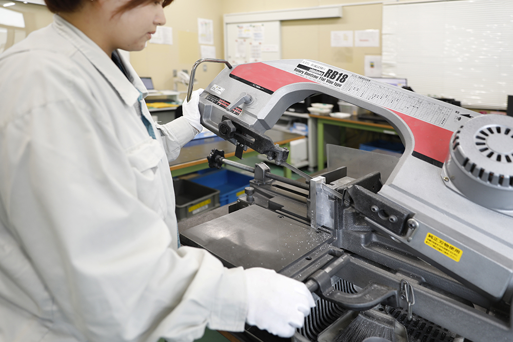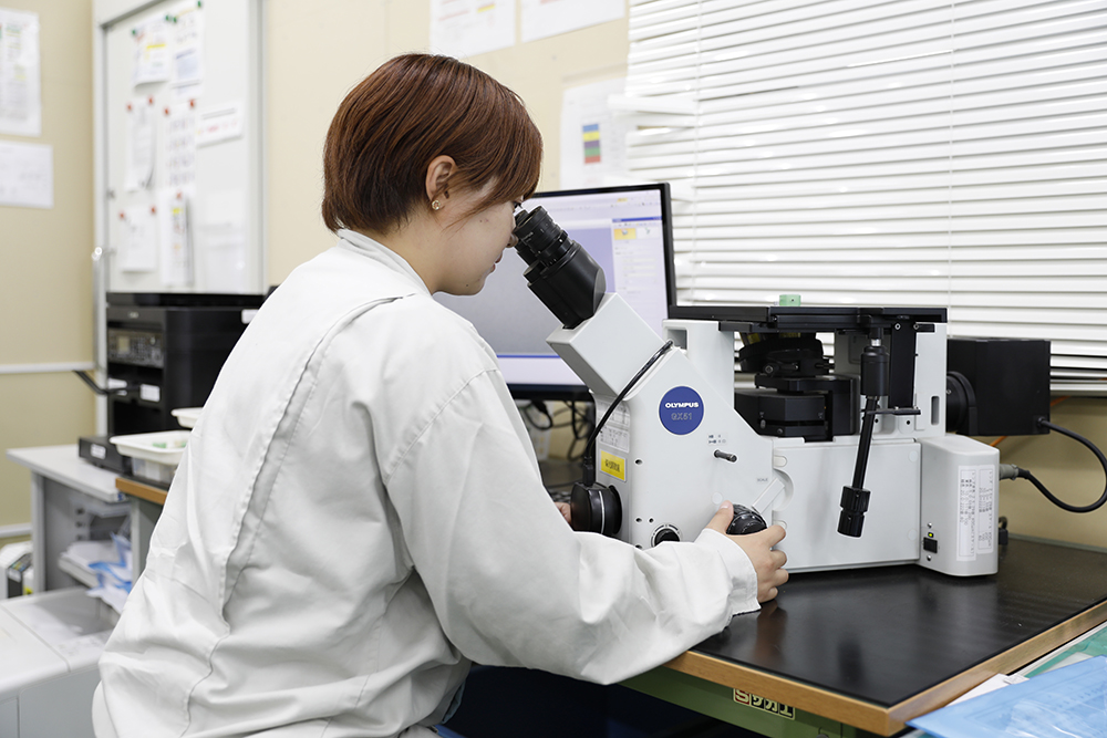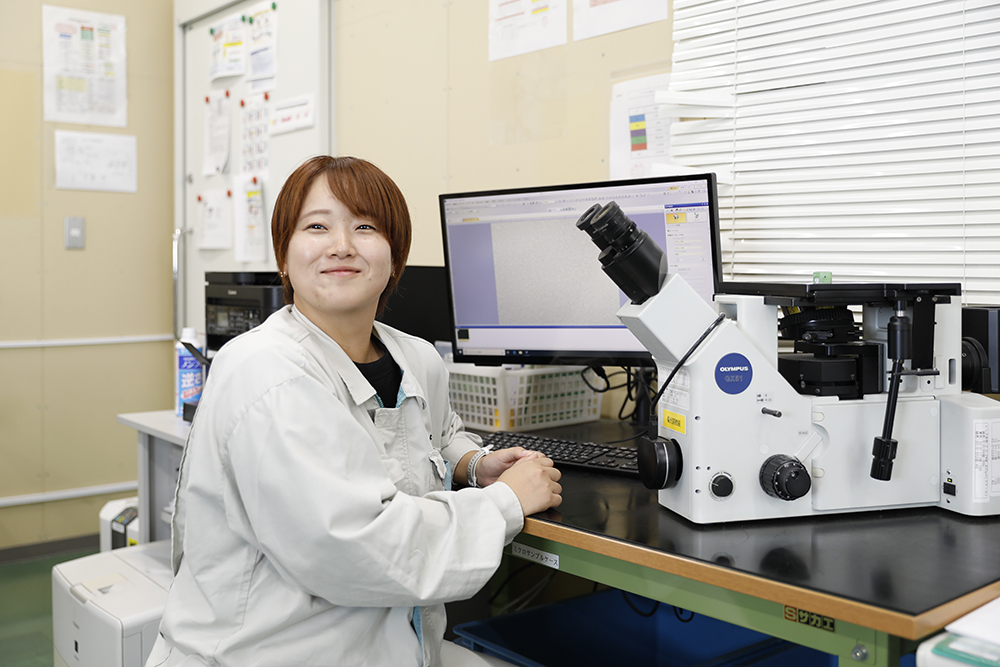 コスにじゅういちで製造している金属材料の品質を確認するため、試験業務を行っています。硬度や導電率の測定のほか、最も重要なのは結晶粒度の測定です。サンプルを鏡面状になるまできれいに磨き、顕微鏡で測定します。細かな作業ですが、わずかな誤差が結果に影響するため集中力が求められます。入社以来ずっと試験グループに所属し、産休・育休を経て復帰した今も変わらずこの業務に取り組んでいます。
