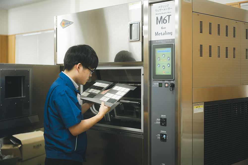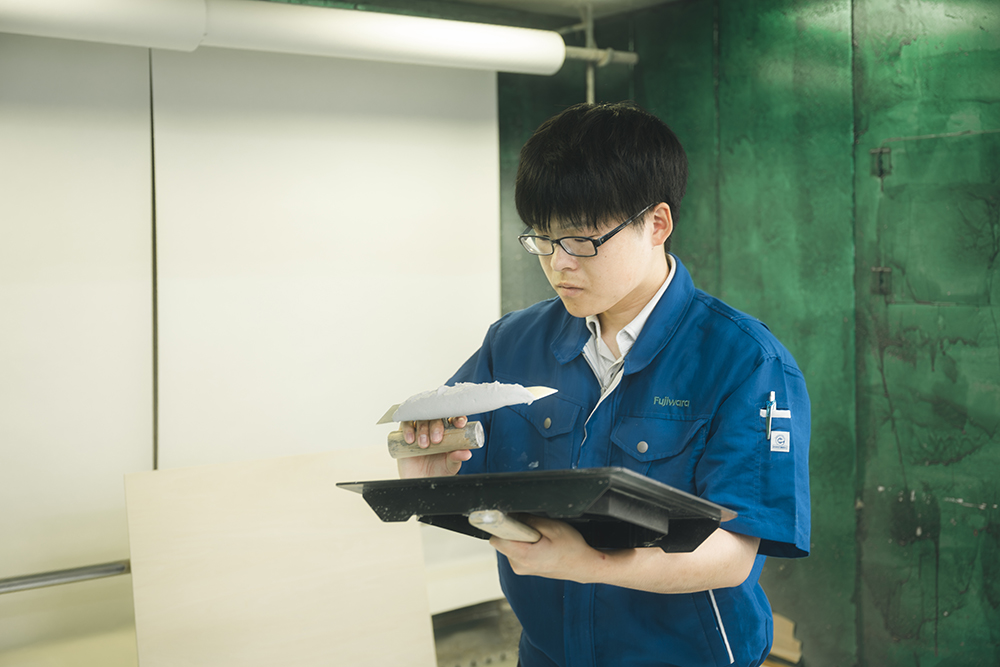 フジワラ化学の主な商材は建築物の壁材(塗り材)で、その商品開発が今の主な仕事です。顧客様のニーズ・要望に応じて企画される製品案を実現するために、薬剤調合や試作品のテストを繰り返したり、既存の製品の改良や、製品開発のために社内外の方とミーティングを行うことも仕事の一つですね。