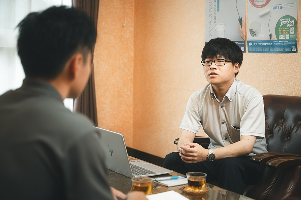 大学で学んだ知見を生かせる「研究開発職」、かつ地元愛媛の企業という2つの条件が就活で重視したポイントでした。就活サイトでフジワラ化学のことを知り、会社説明会や会社見学の時に先輩たちと交流する中で、社が掲げる「人を大事にする会社」というのを実際に肌で感じられた点も、入社を決める後押しになりました。