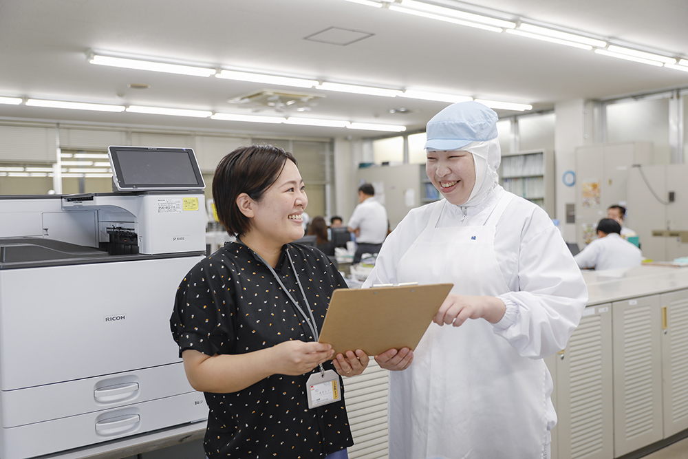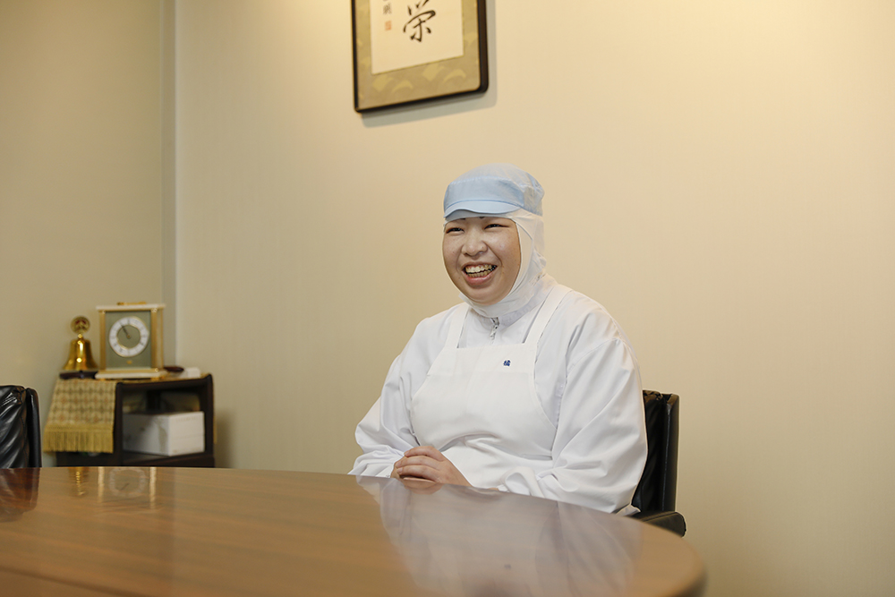 チームワークが大切な職場なので、普段からコミュニケーションを取りながら進めています。明るい雰囲気を作っているのが工場長。ご自身の仕事も早いし、周りの状況判断も早い。憧れの先輩です。そういう方のもとで働けるのは、大きな刺激になります。自分もチーフとして現場を動かし、盛り上げていく立場としても工場長から学んでいきたいと考えています。また育児をしながら働くことに対しても理解のある環境で、子どもの体調が悪い時は快く送り出してくださるのでありがたいです。有給も取りやすく、繁忙期以外は比較的調整しやすい環境です。