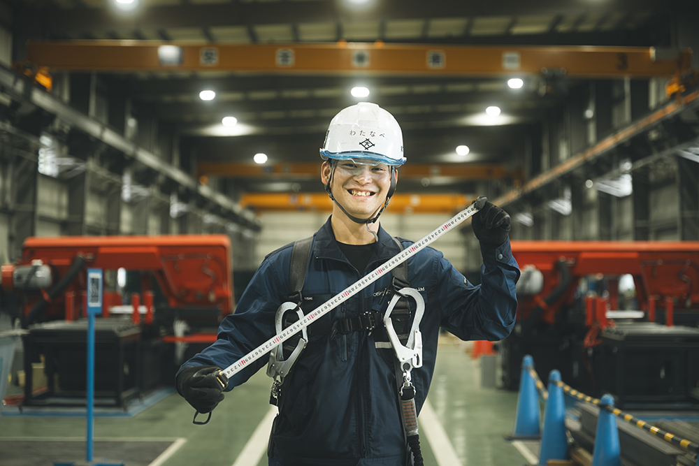 新居浜市に生まれ育ち、元々工業系の職種が身近にあった渡辺さん。現在は主に化学プラント(特定の原材料を大量生産・製造する大規模な工場設備)のメンテナンス業務を担当しており、勤務の中心は関連会社の敷地内にある工場です。現場によっては、数十人規模の下請け業者様をまとめる立場になるため、責任は重大。しかし、だからこそやりがいも大きく、自分の仕事が製造現場を支えていることを実感できるそうです。