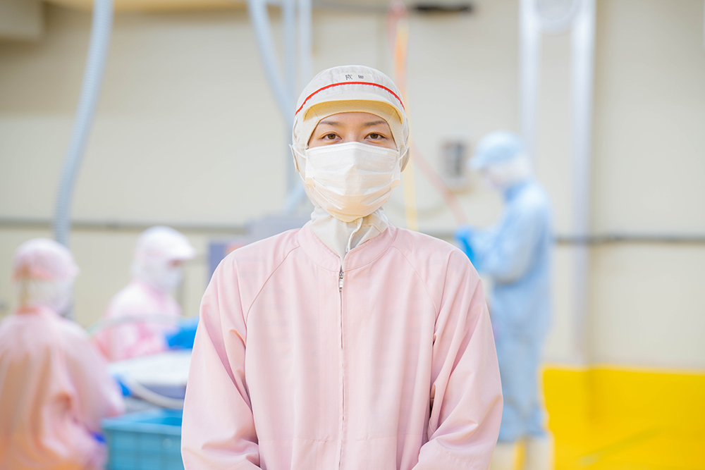 入社後、製造部に配属され、それ以降ずっとしらすから異物を取り除く選別作業に携わっています。選別はお客さまからのクレームを防ぐ要(かなめ)の作業であるため、常に高い意識を持って取り組んでいます。現在は選別作業を行いながら、主任として部署の取りまとめも任されています。同僚にはベトナムから働きに来ている若い人たちもおり、部署間のコミュニケーションが円滑に進むよう工夫したり、働くことへのモチベーションを高めるにはどうしたらよいか日々試行錯誤を続けています。