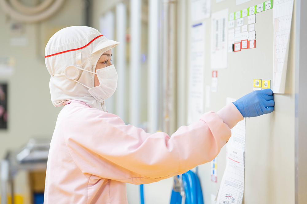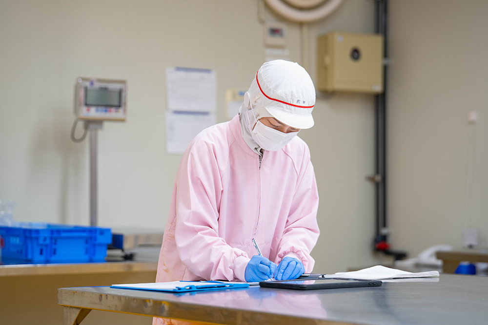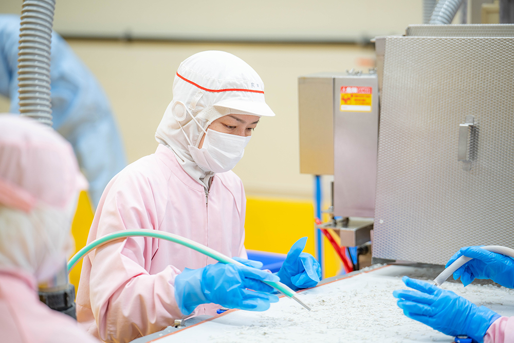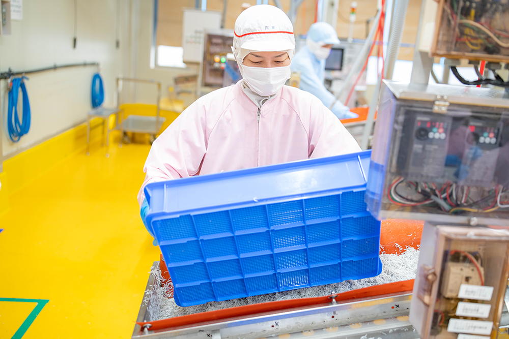 私が担当している作業場が、釜でゆであげられたしらすに混入しているイカやタコ、他の魚の稚魚といった異物を、ホース状の専用の器具を使って取り除く「異物選別」を行う場所です。商品のクレームで最も多いのは異物混入であるため、作業者全員が高い意識をもって作業に取り組めるように、シフトの管理、業務進捗の管理、業務の段取り等を行っています。