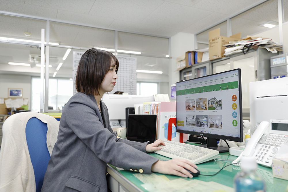 入社当初は「家づくりに関わる仕事」という漠然とした憧れでしたが、事務職、広報、営業アシスタントなど、さまざまな業務を経験する中で、自分が家づくりのどの部分に携わりたいのかが明確になりました。今は、お客様と一緒にプランを考え、ご提案する仕事がしたいと思っています。夢の実現に向けて、インテリアコーディネーター資格の取得を目指し、図面ソフトを使った間取り図の作成も練習中です。