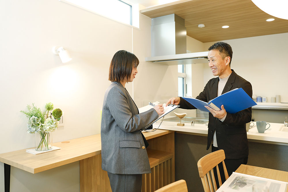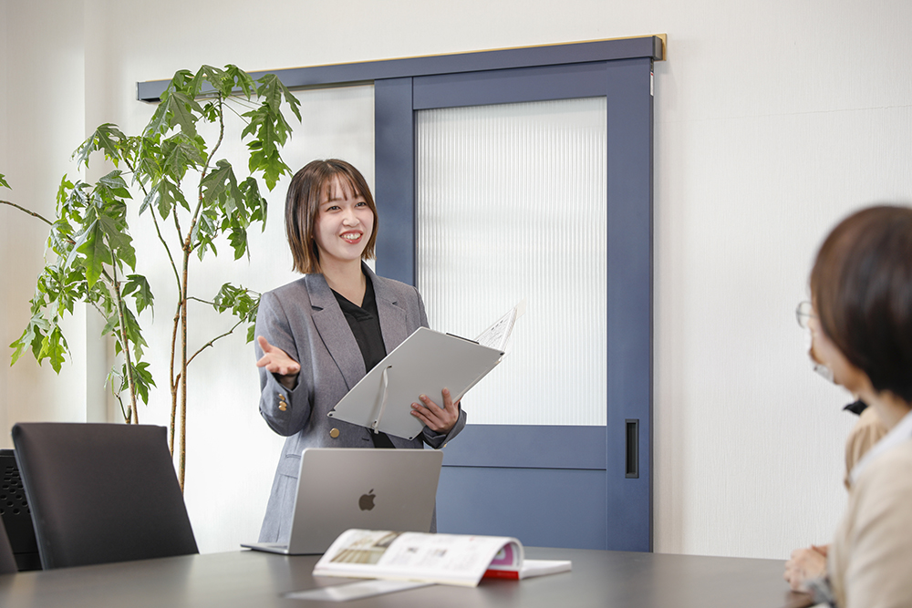 広報活動に関する業務が中心です。注文住宅のプロデュースやリフォームを展開しているグループ会社と連携し、チラシや広報物の制作、販促活動の打ち合わせ、見学会などのイベント設営などを行っています。最近では、営業職の先輩がお客様と打ち合わせをする際などに、お子さんのお世話をしたり、土地探しのお手伝いをしたりと、営業アシスタント的な業務にも携わっています。