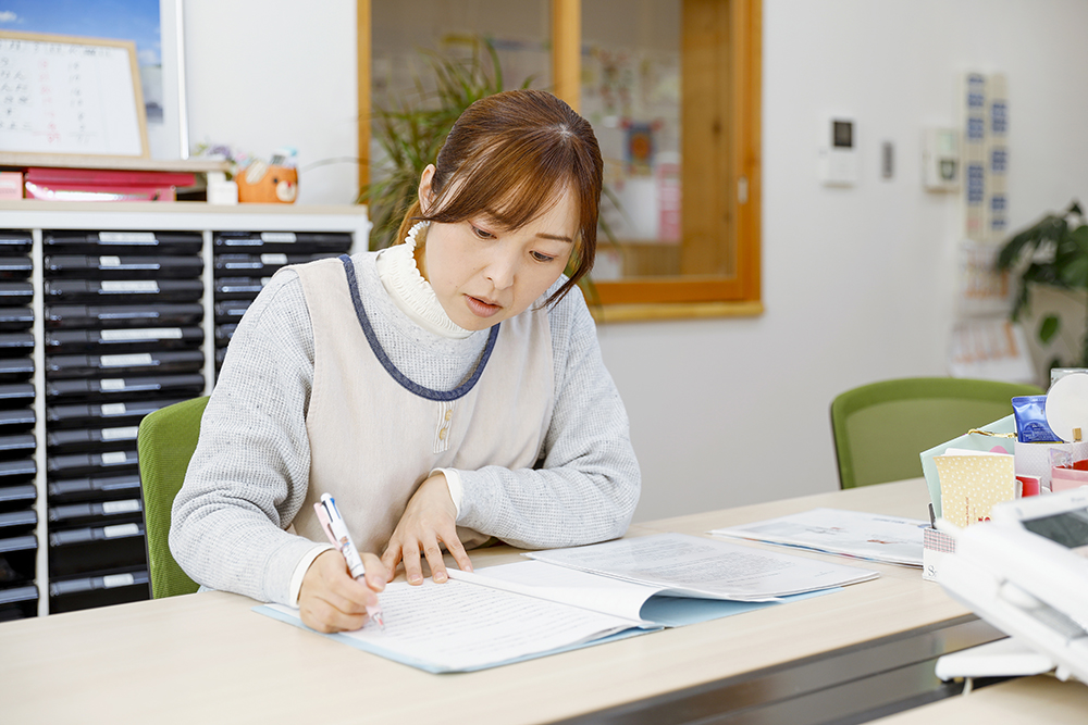 園児の身の回りの世話をし、基本的な生活習慣を身につけるための保育や教育を行っています。成長の記録、遊びや行事の計画、保護者の育児への不安に寄り添う保護者支援も保育士の仕事です。主任保育士という立場なので、園全体の状況を把握する必要があります。書類のチェックや行事進行のほか、休みの保育士に代わってクラスに入ることもあります。