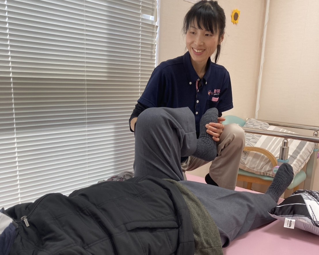 利用者さんのご自宅に直接訪問し、実際に使用されているベッド上で関節を動かしたり、立ち上がりや手すりの使い方を確認したり、歩ける方は一緒に歩いたりしながら、個々の運動能力や疾患の状態に合わせたリハビリをしています。