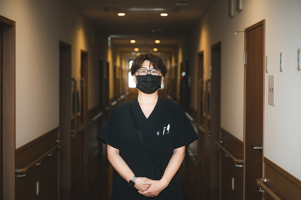 私は看護師ですが、施設の特性上、介護と看護の業務に大きな区切りがないため、状況に応じて臨機応変に双方の業務を担っています。現在は統括主任という立場でもあるため、身体介護や生活支援など現場業務のフォローを行いながら、どちらかといえば施設全体のスタッフの統括・指導やデスクワークを中心に担当することが多くなっています。