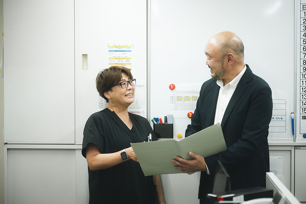 普段は、利用者さまと接する時間以上に、スタッフへの指導・指示を行う場面が多くあります。その際、職員の皆さんに気持ちよく働いてもらえるようなコミュニケーションを大切にしています。「気を付けてください」「頑張ってください」といった一方的な指示・指導でなく、「一緒に○○しましょう」と寄り添うような言い回しを心がけています。