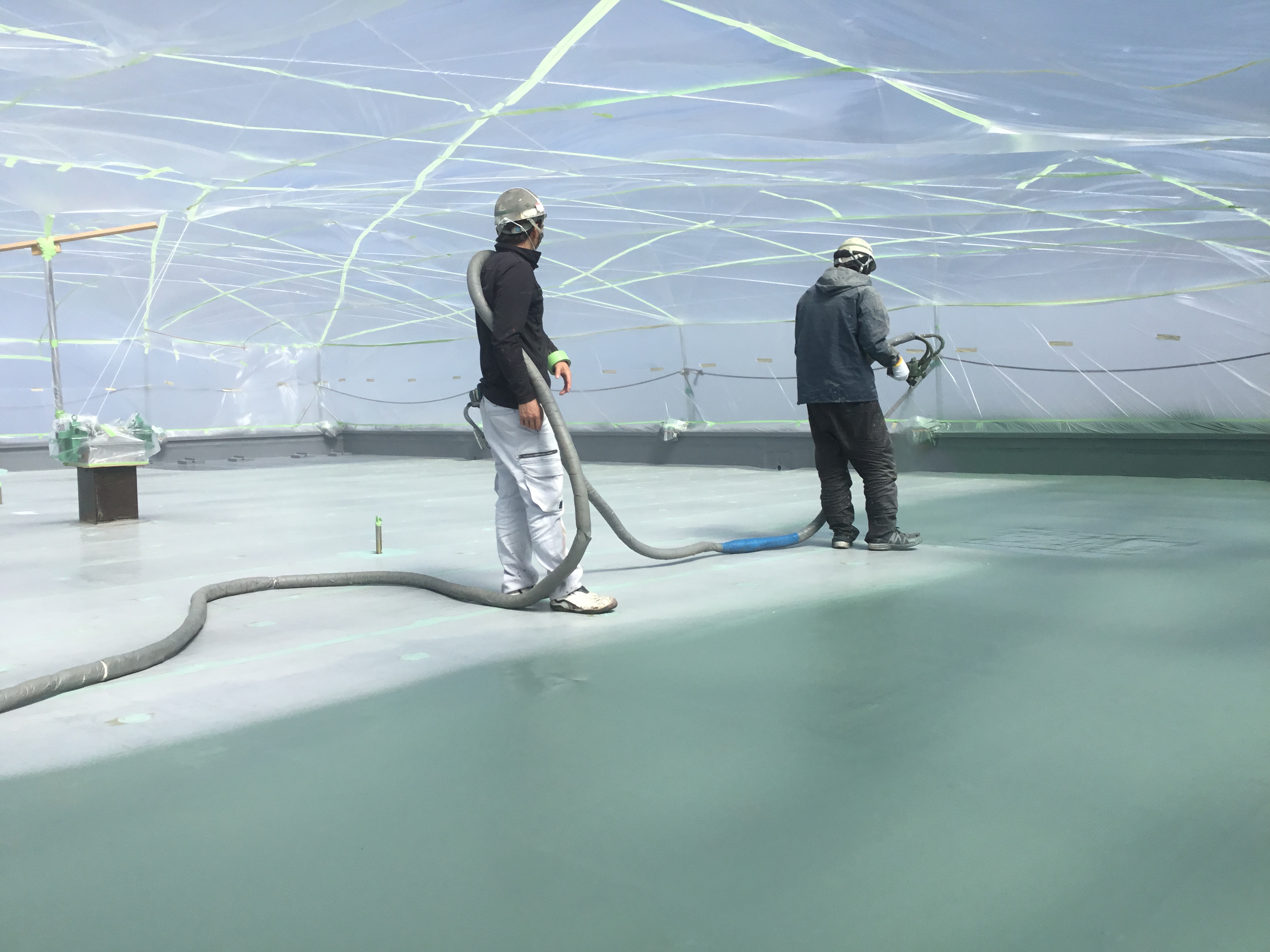 工事部に所属し、超速硬化ウレタン吹付工法「リムスプレー」を搭載した専用車両で現場へ向かい、吹付工をはじめとする多岐にわたる防水工事を担当しています。