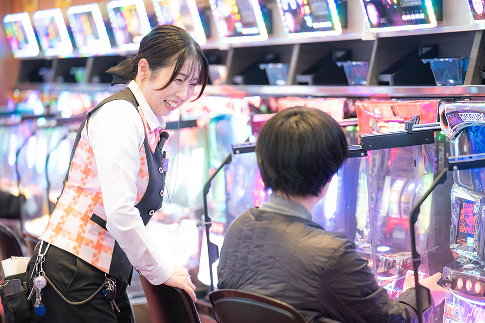 ホールでの現場作業としては、足を運んで下さる方への接客や機器のトラブル対応、景品の交換や発注などがあります。バックヤード作業としては新しく入って来た新台準備や毎月開催される店舗イベントの計画・準備、あとは訪れる業者さんへの対応などなど…。お店によってシステムや機器の連携が若干違うので、広く浅くいろんな業務を担当しているような感じですね。